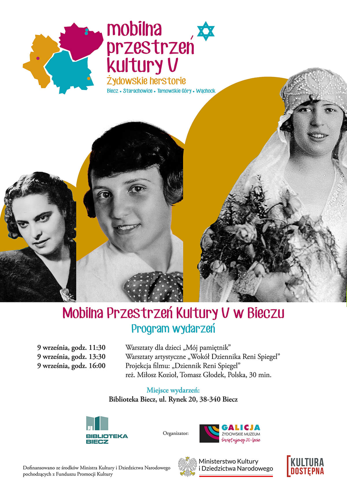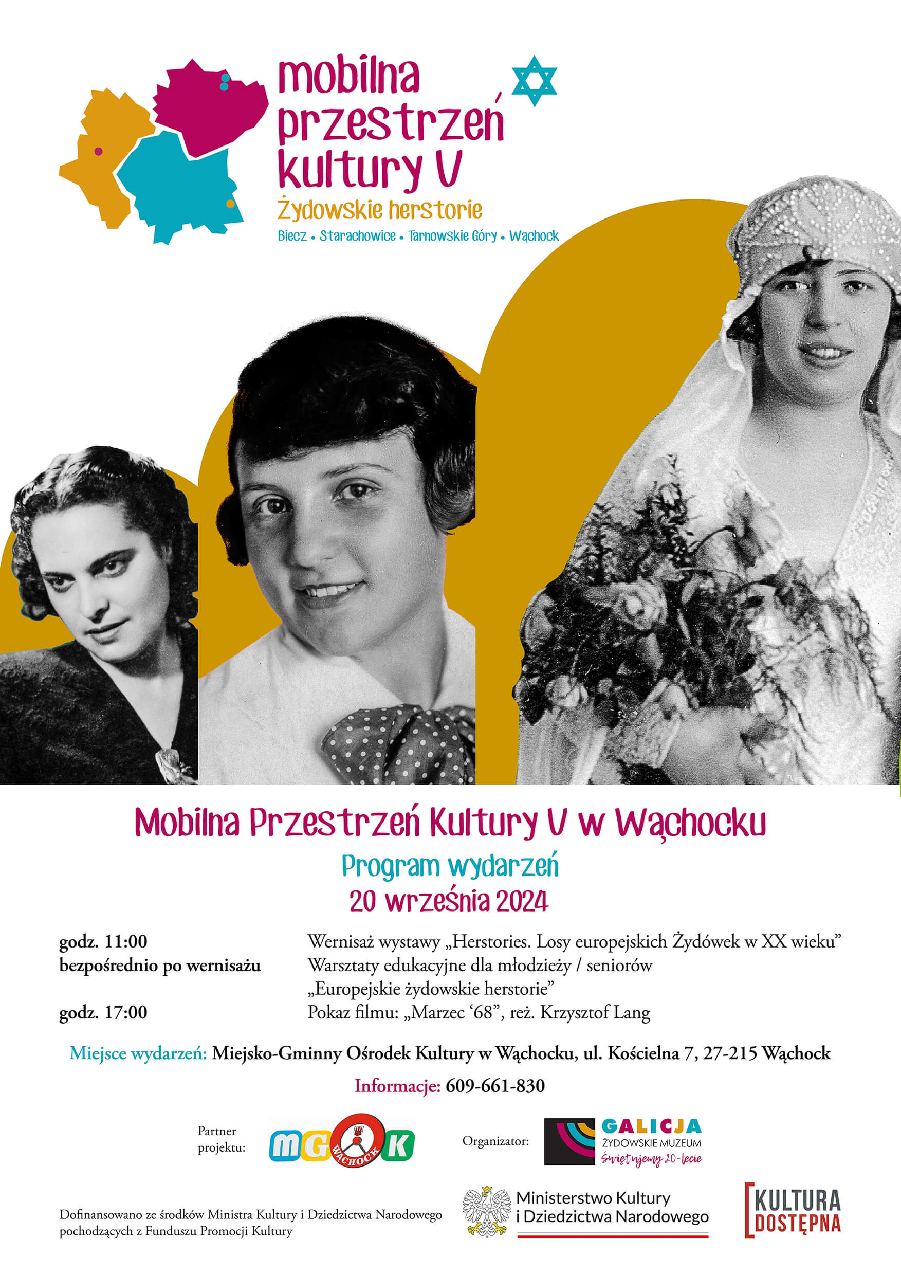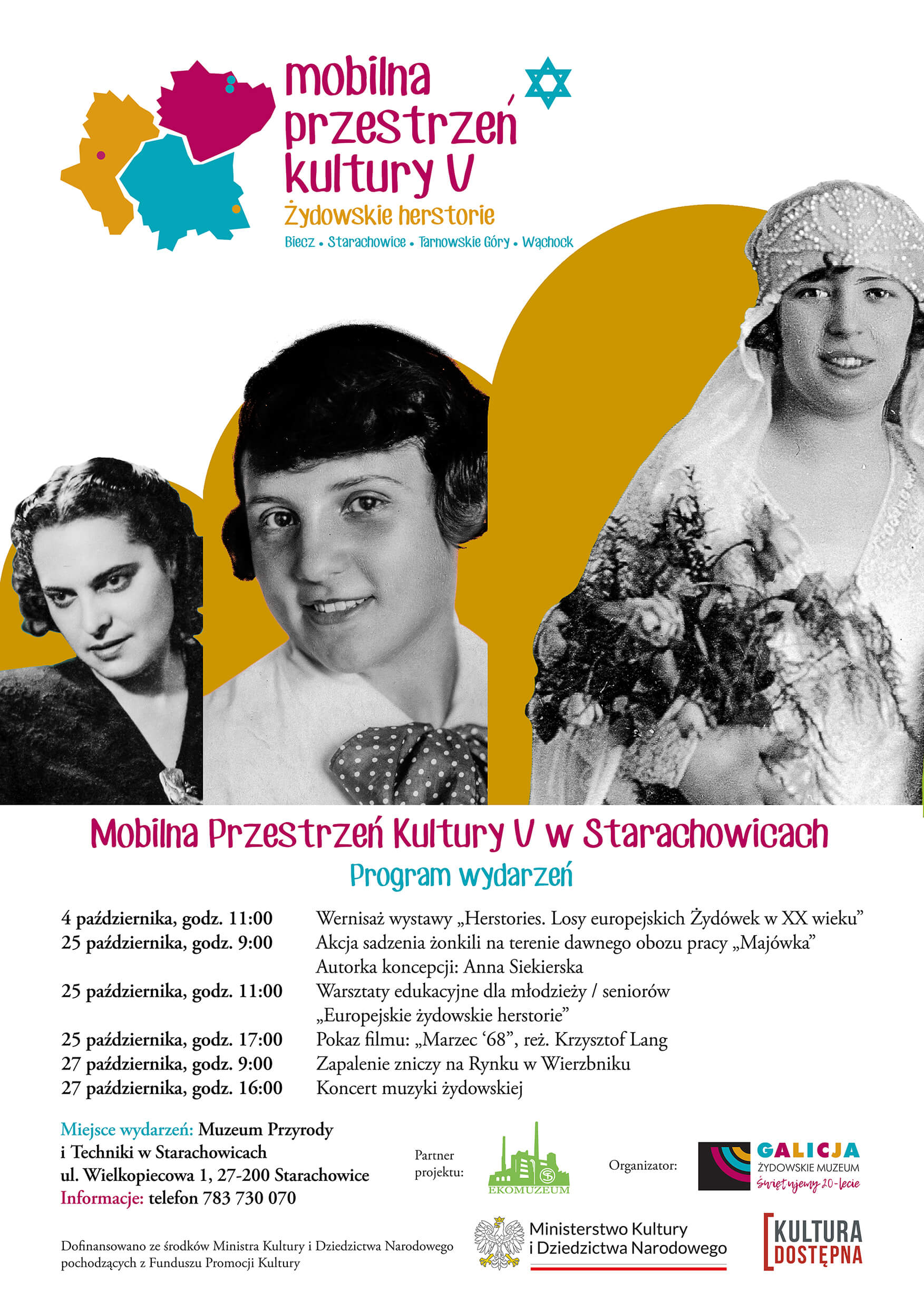 „Mobilna Przestrzeń Kultury V. Żydowskie herstorie” to kontynuacja projektu realizowanego z sukcesem od 2016r. Projekt zakłada przygotowanie mobilnej oferty kulturalno-edukacyjnej związanej z dziedzictwem żydowskim i zrealizowanie cyklu 10 wydarzeń (wystawa, warsztaty, pokazy filmowe, wykłady edukacyjne dla różnych grup odbiorców) w wybranych 4 miejscowościach województw małopolskiego, świętokrzyskiego i śląskiego.