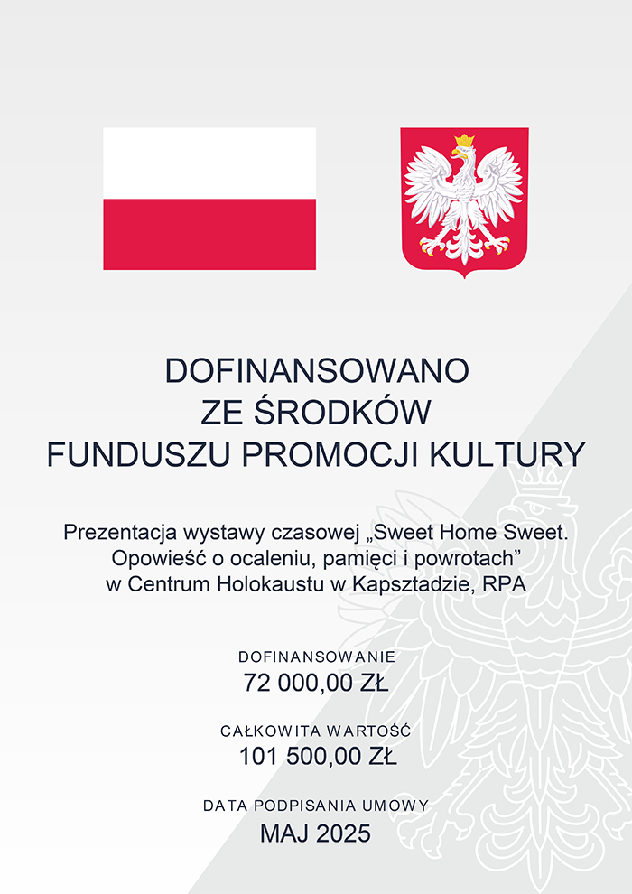 Projekt „Prezentacja wystawy czasowej Sweet Home Sweet. Opowieść o ocaleniu, pamięci i powrotach w Centrum Holokaustu w Kapsztadzie, RPA” uzyskał dofinansowanie w ramach programu Ministra Kultury i dziedzictwa Narodowego pt. „Promocja Kultury Polskiej za granicą”.